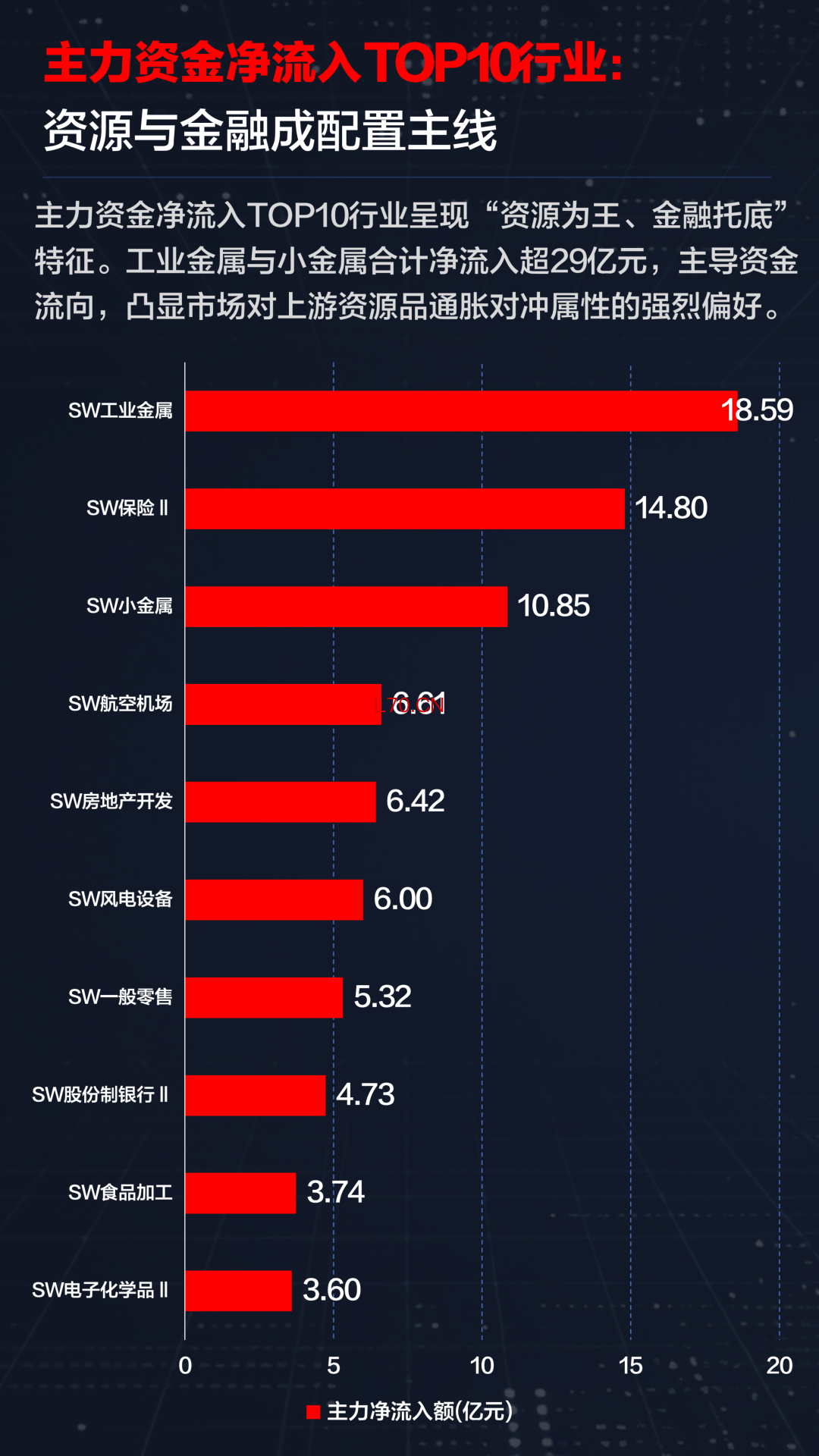 行业配置方面,按申万一级行业统计,主力资金流入居于首位的是有色金属,主力净流入额超16亿元,凸显市场对上游资源品通胀对冲属性的偏好。