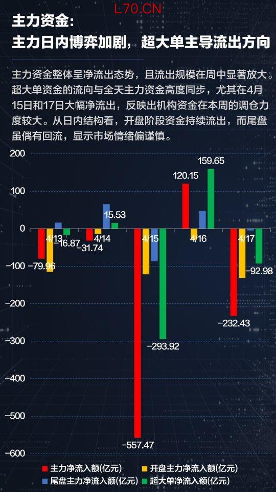 散户资金本周仅4月14日微幅流出,15日单日爆发437亿元净流入(净流入率1.80%)达情绪高点,后半周规模回落但仍保持百亿级流入。