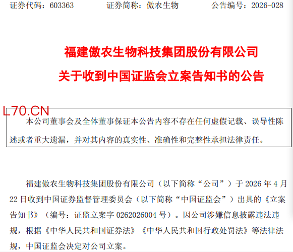 4月22日晚间,傲农生物(维权)(603363)公告,因公司涉嫌信息披露违法违规,中国证监会决定对公司立案。