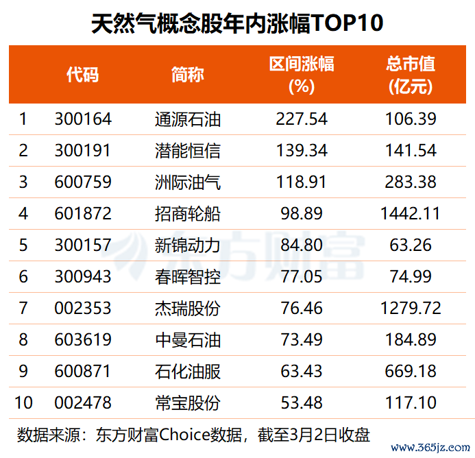 东方财富概念板块显示,目前A股市场共有逾百只天然气概念股,除了“三桶油”,招商轮船、杰瑞股份体量均超千亿元,中海油服、中集集团、新奥股份、石化油服、上海电力5股总市值均在600亿元以上。