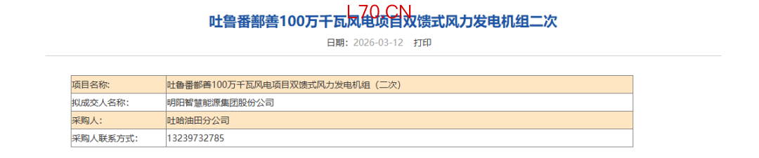 北极星风力发电网获悉,近日,吐鲁番鄯善100万千瓦风电项目(二次)招标结果揭晓。明阳智慧能源集团股份公司(下称“明阳智能”)成功中标,成为拟成交人,斩获这份由中国石油天然气集团吐哈油田分公司主导的、装机规模高达1吉瓦(GW)的清洁能源大单。