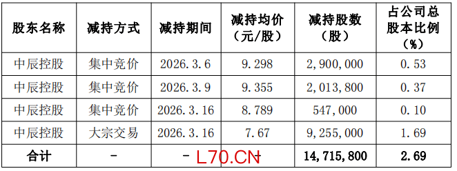 自本次减持计划实施至今(2026年3月6日至2026年3月16日),中辰控股以集中竞价交易及大宗交易的方式共计已减持公司股份14,715,800股,占公司总股本的2.69%,减持均价为7.67元/股至9.355元/股,本次减持计划期限已届满,本次减持计划已实施完成。